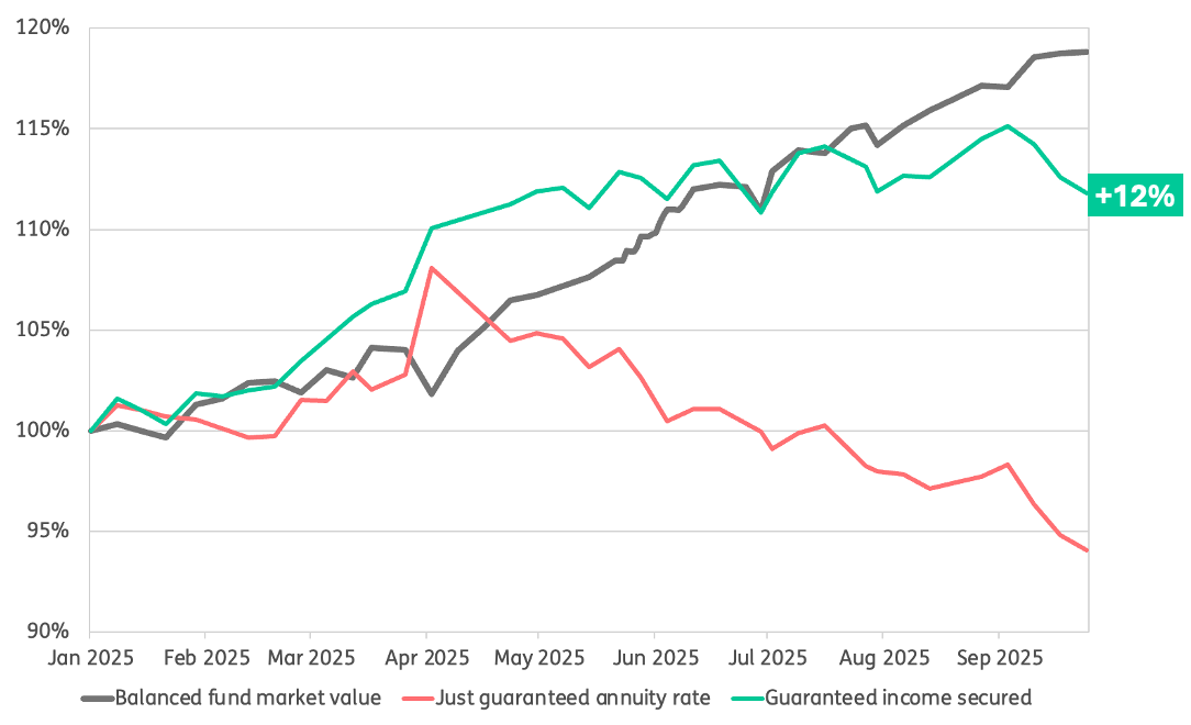 A further benefit of good balanced fund performance is that the effective guaranteed income which a client can secure has increased materially, despite the fact that annuity rates have come off their recent highs experienced around April 2025.